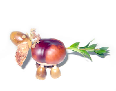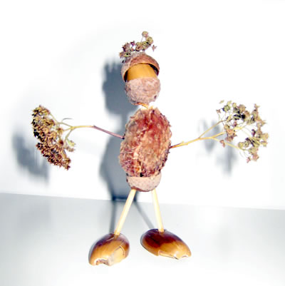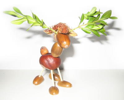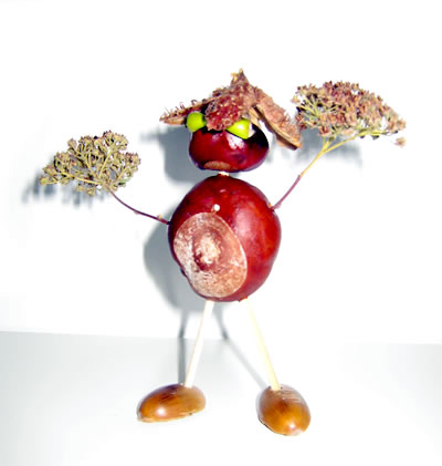 Met spulletjes die je in de herfst in het bos tegenkomt — zoals kastanjes en eikeltjes — en wat takjes uit je eigen tuin kun je best grappige figuurtjes knutselen.