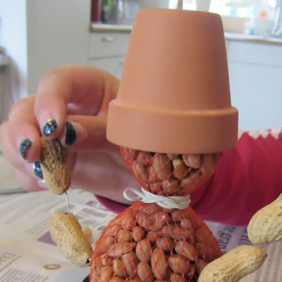 De touwtjes die je in de vorige stap door het net hebt gestoken doe je door het gat in het bloempotje. Om de hoed van het mannetje goed vast te zetten kun je eventueel een knoop bovenop het bloempotje leggen. | |